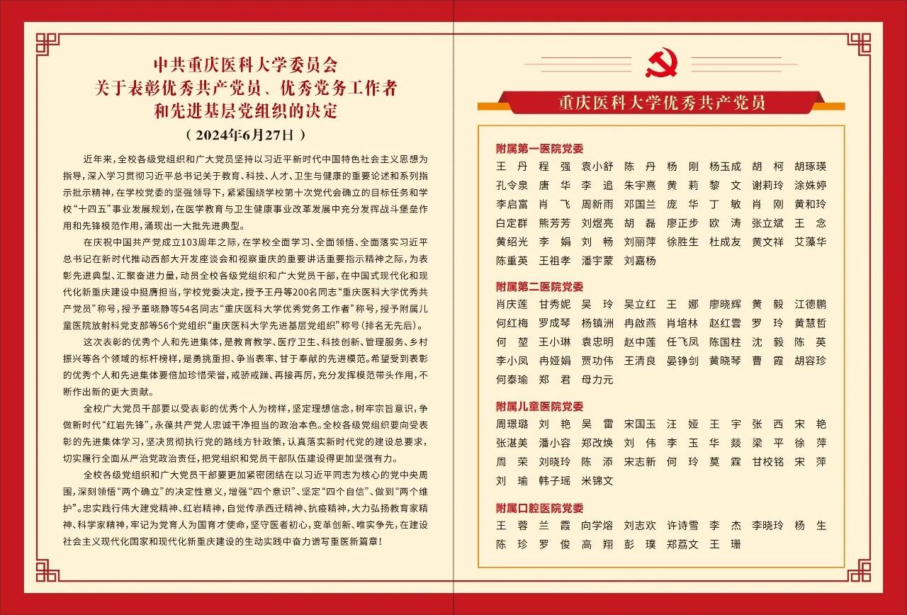 《决定》授予王丹等200名同志“荣耀体育在线登录入口优秀共产党员”称号,授予董晓静等54名同志“荣耀体育在线登录入口优秀党务工作者”称号,授予附属儿童医院放射科党支部等56个党组织“荣耀体育在线登录入口先进基层党组织”称号。与会领导为优秀共产党员、优秀党务工作者以及先进基层组织颁发证书、牌匾。