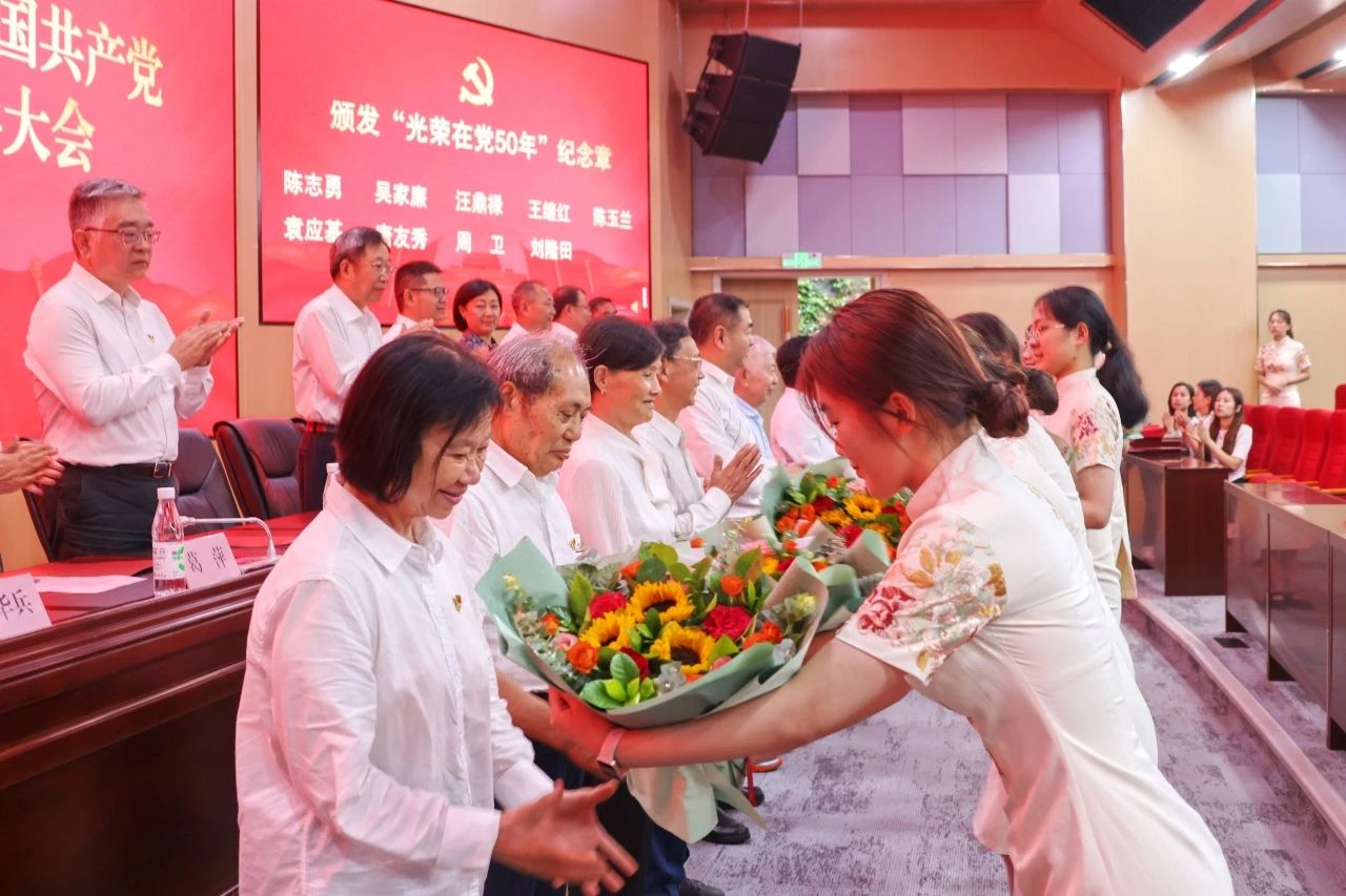 校党委副书记冯跃林主持大会。出席大会的领导向荣耀体育在线登录入口及各附属医院党龄达50年的老党员颁发“光荣在党50年”纪念章。陈志勇、吴家廉、汪鼎禄、王继红、陈玉兰、袁应基、唐友秀、周卫、刘隆田等9名“光荣在党”50年的老党员代表在现场获颁纪念章。