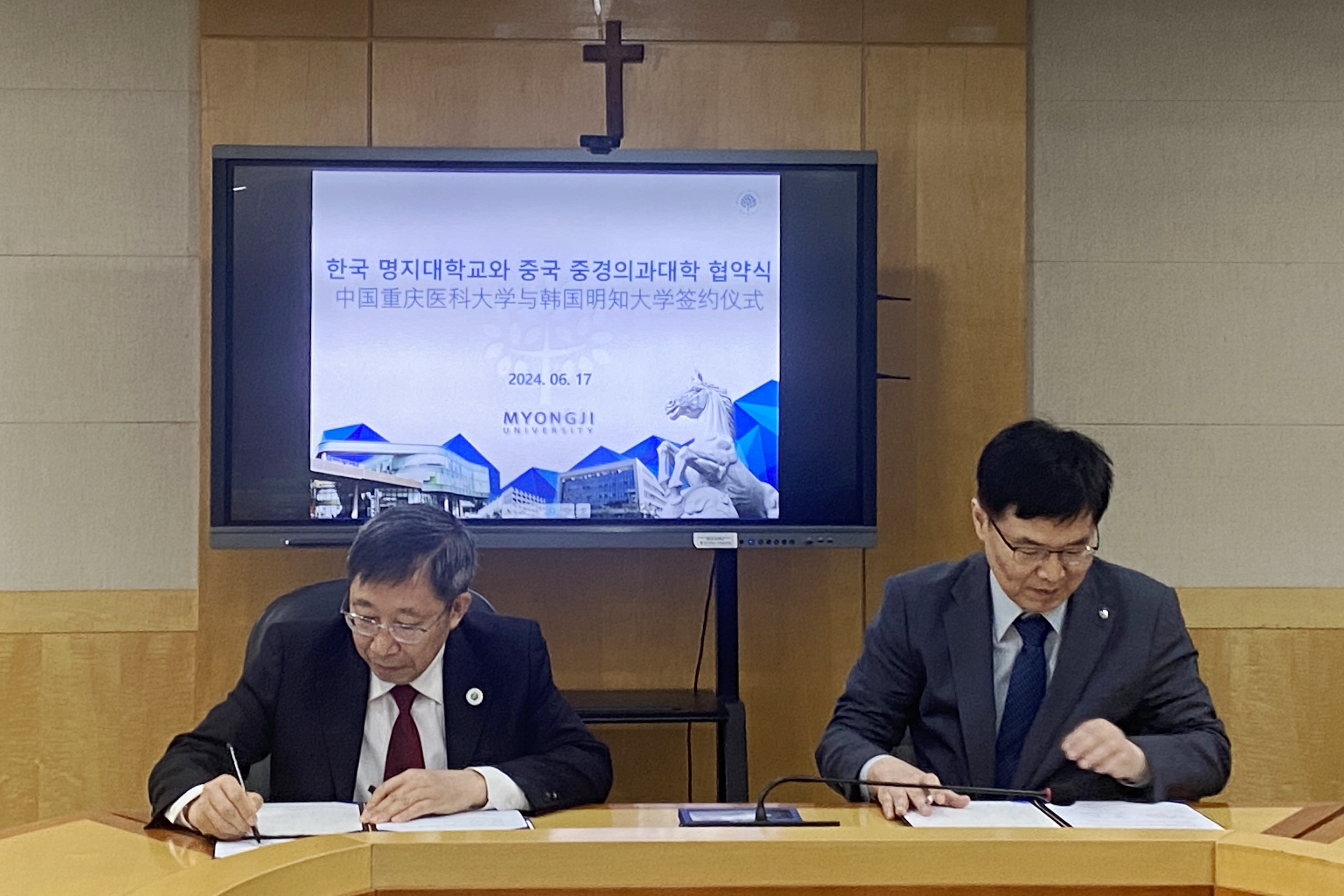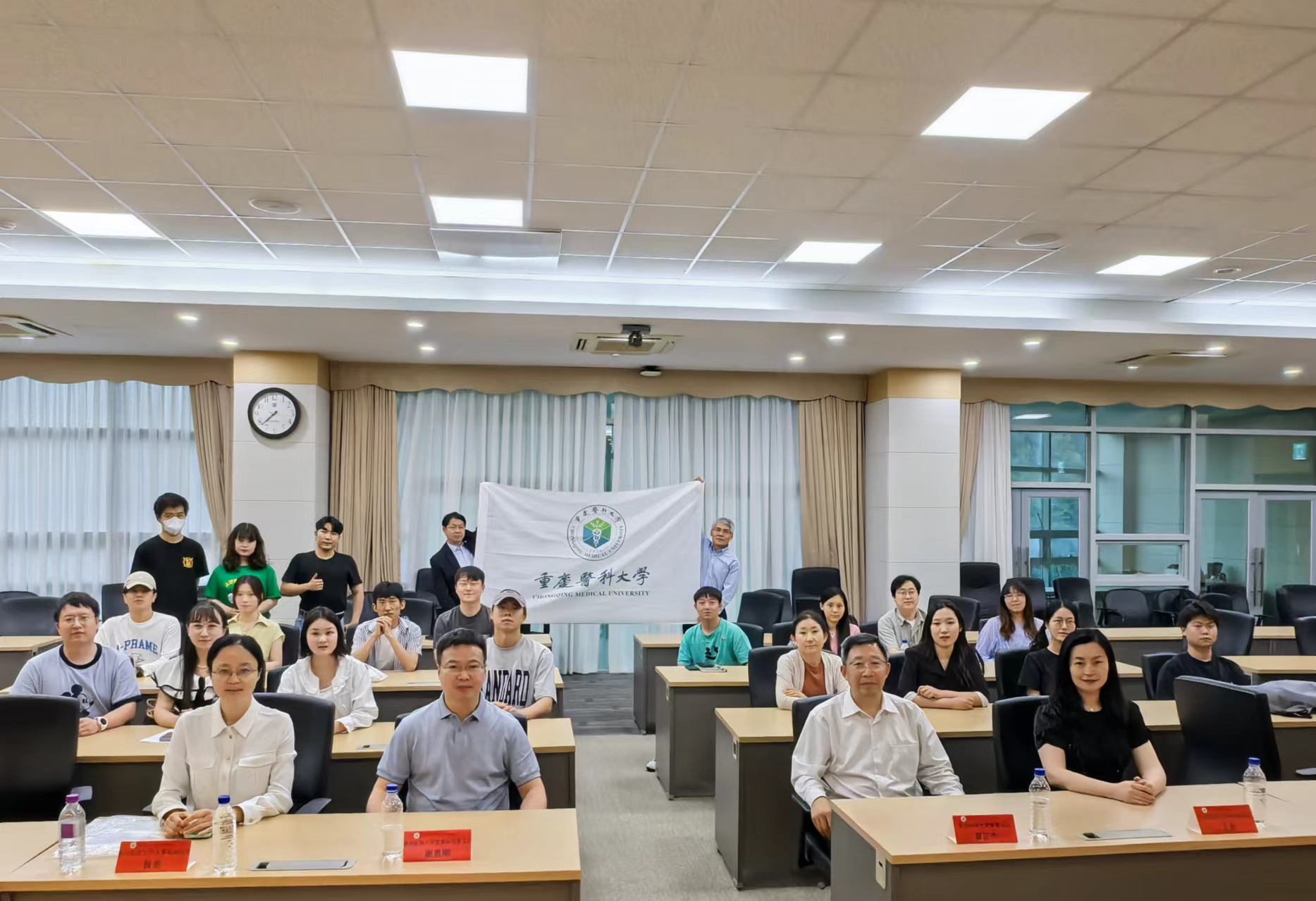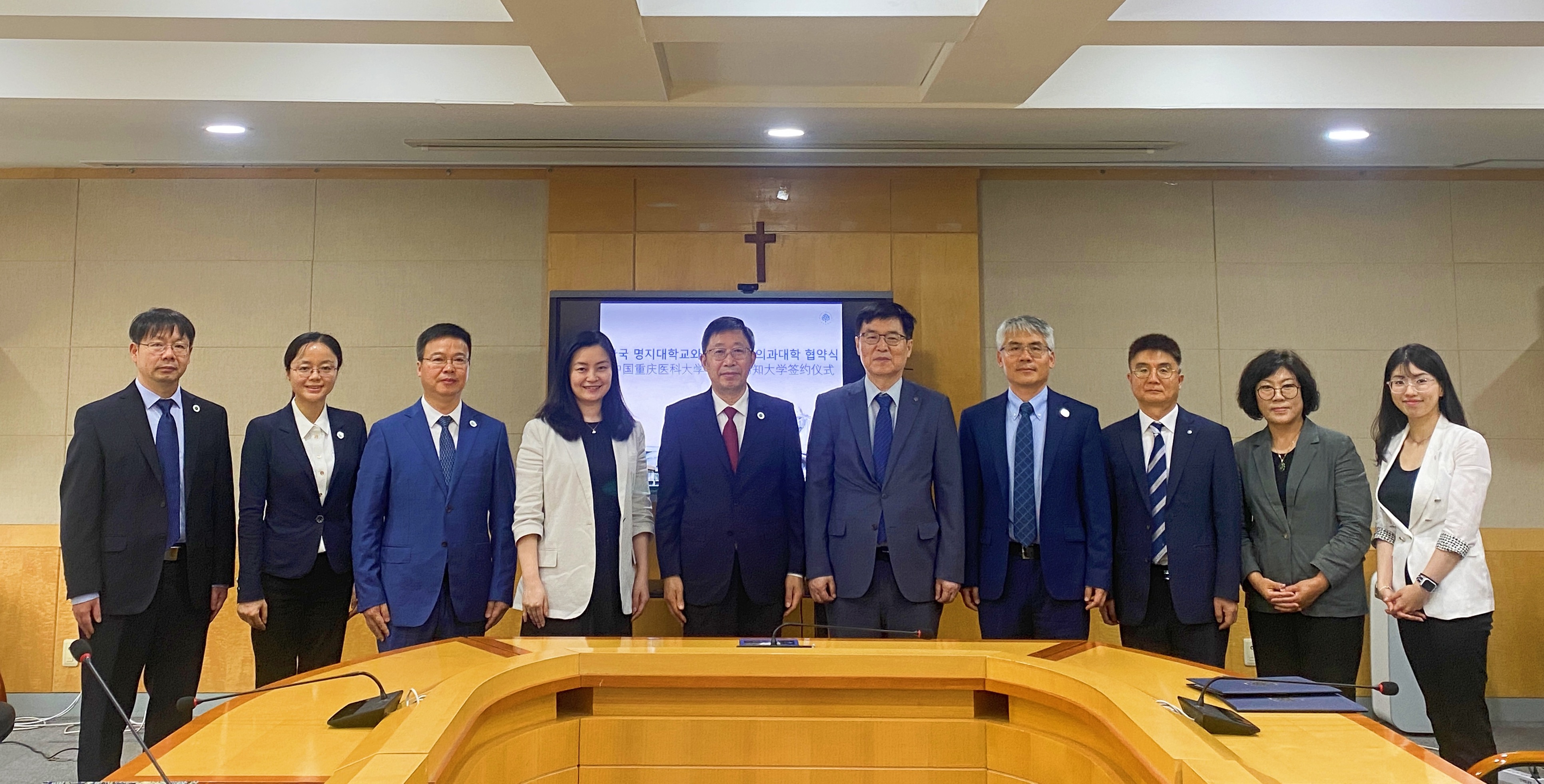 在韩国明知大学访问期间,覃正杰一行与明知大学分管教学的副校长宣正源、国际处处长李汀国及相关人员展开座谈,双方就未来在公共卫生、生命科学、医工交叉等领域开展科研教学合作达成一致。