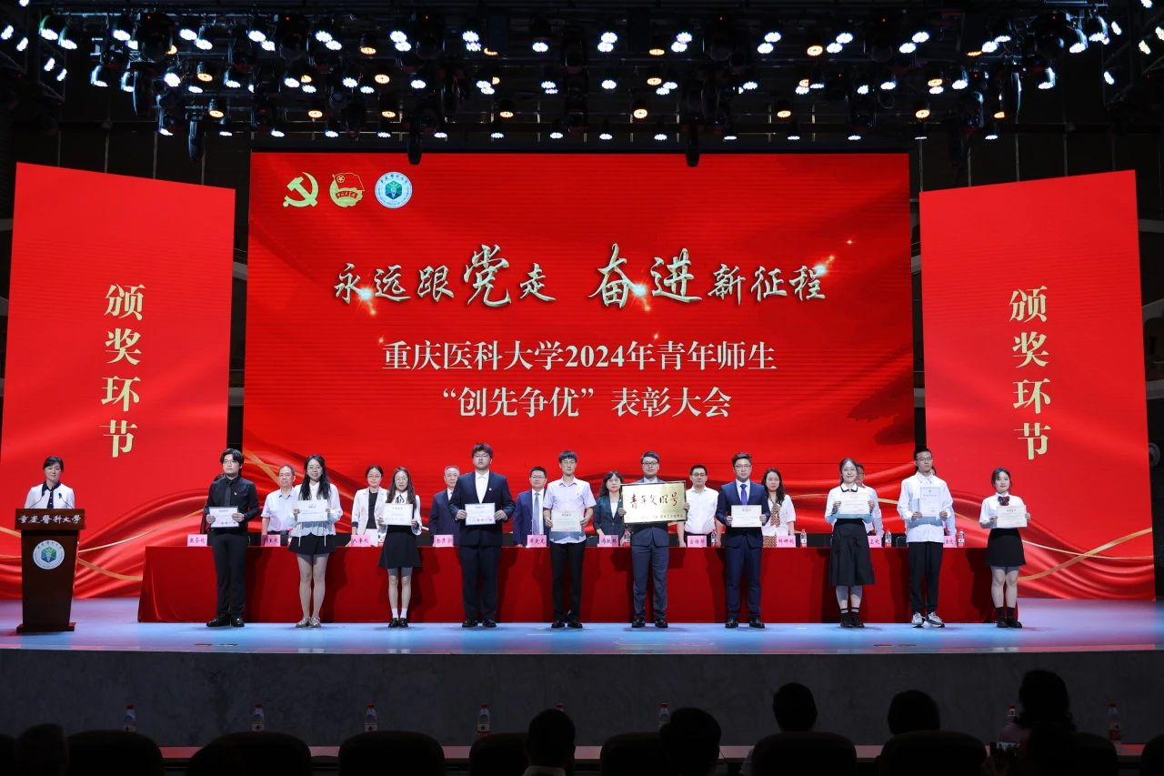 校长黄爱龙、校党委副书记冯跃林为重医青年五四奖章、重医学子年度人物颁奖。