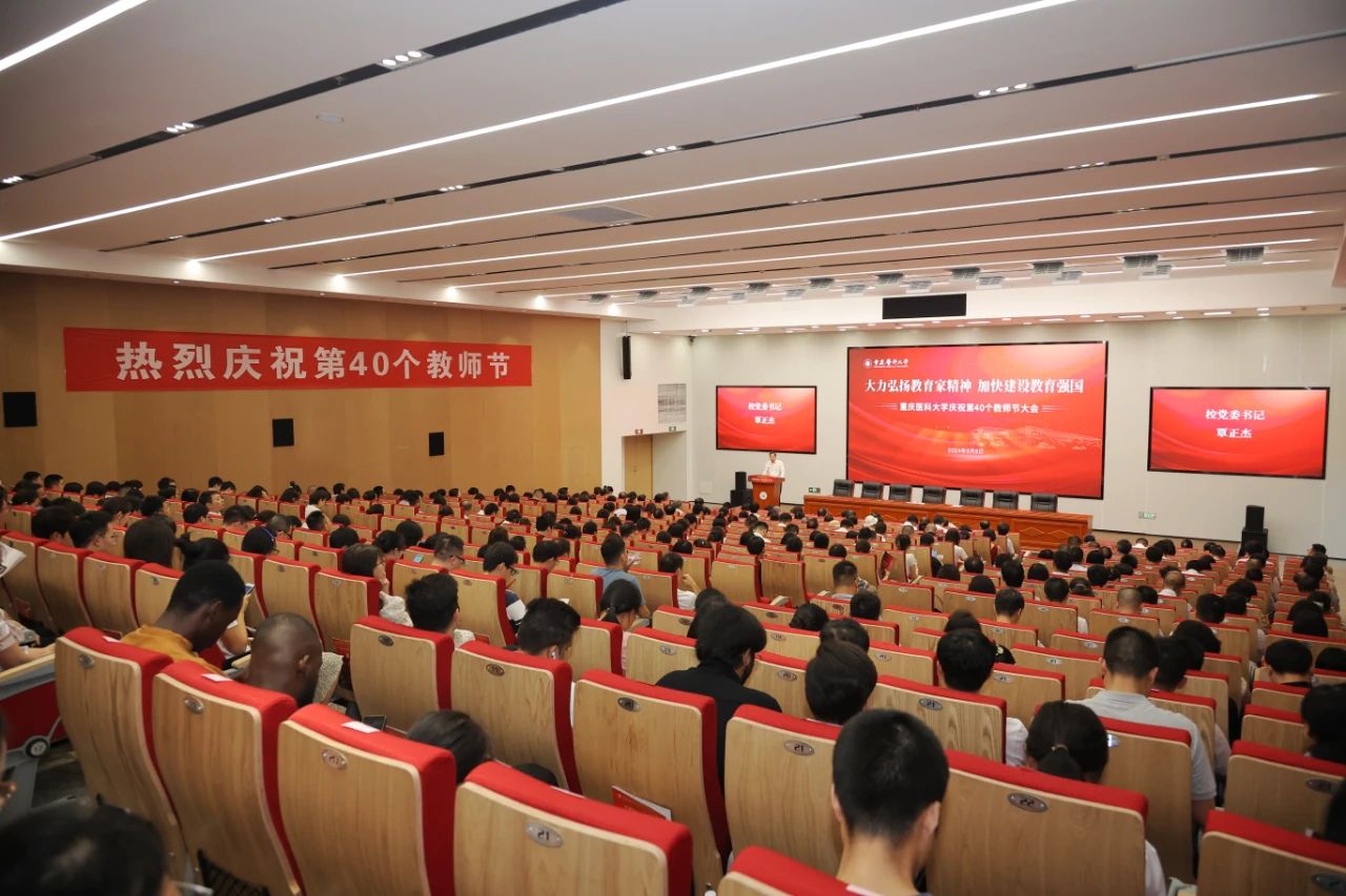 9月9日,荣耀体育在线登录入口在袁家岗校区崇医楼二楼报告厅隆重召开庆祝第40个教师节大会。校领导覃正杰、黄爱龙、田杰、余彦学、邱景富、葛萍、余华荣出席大会。校党委常委、副校长田杰主持大会。