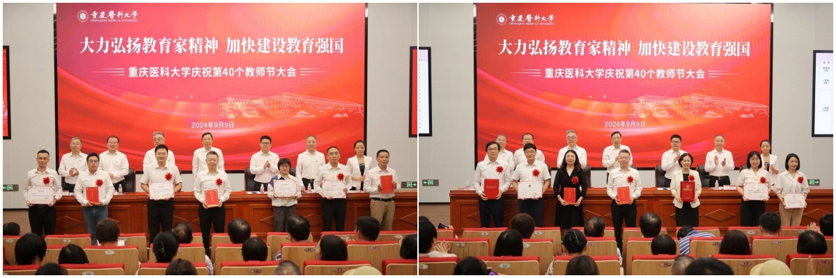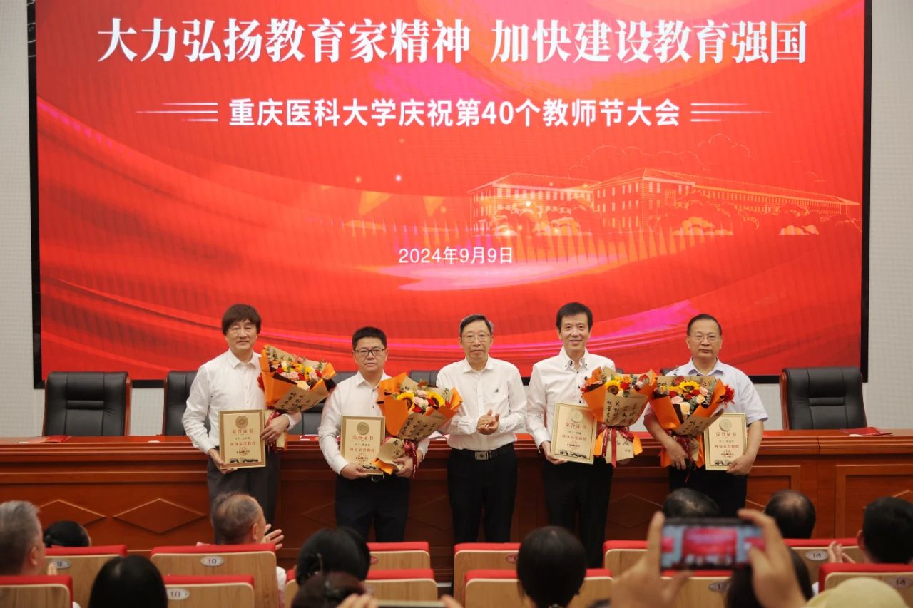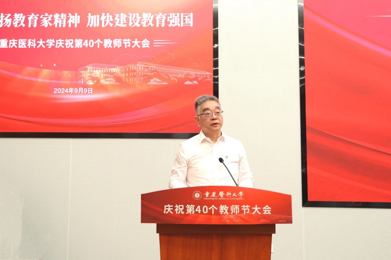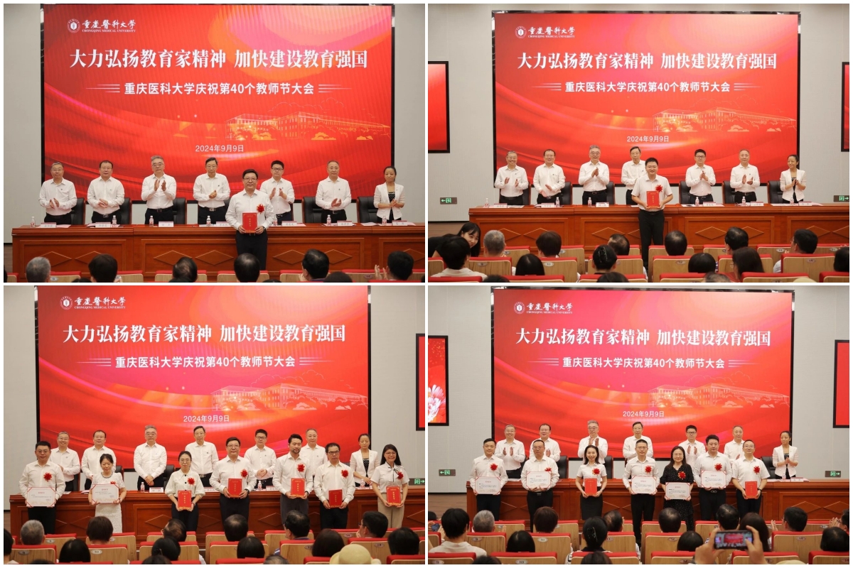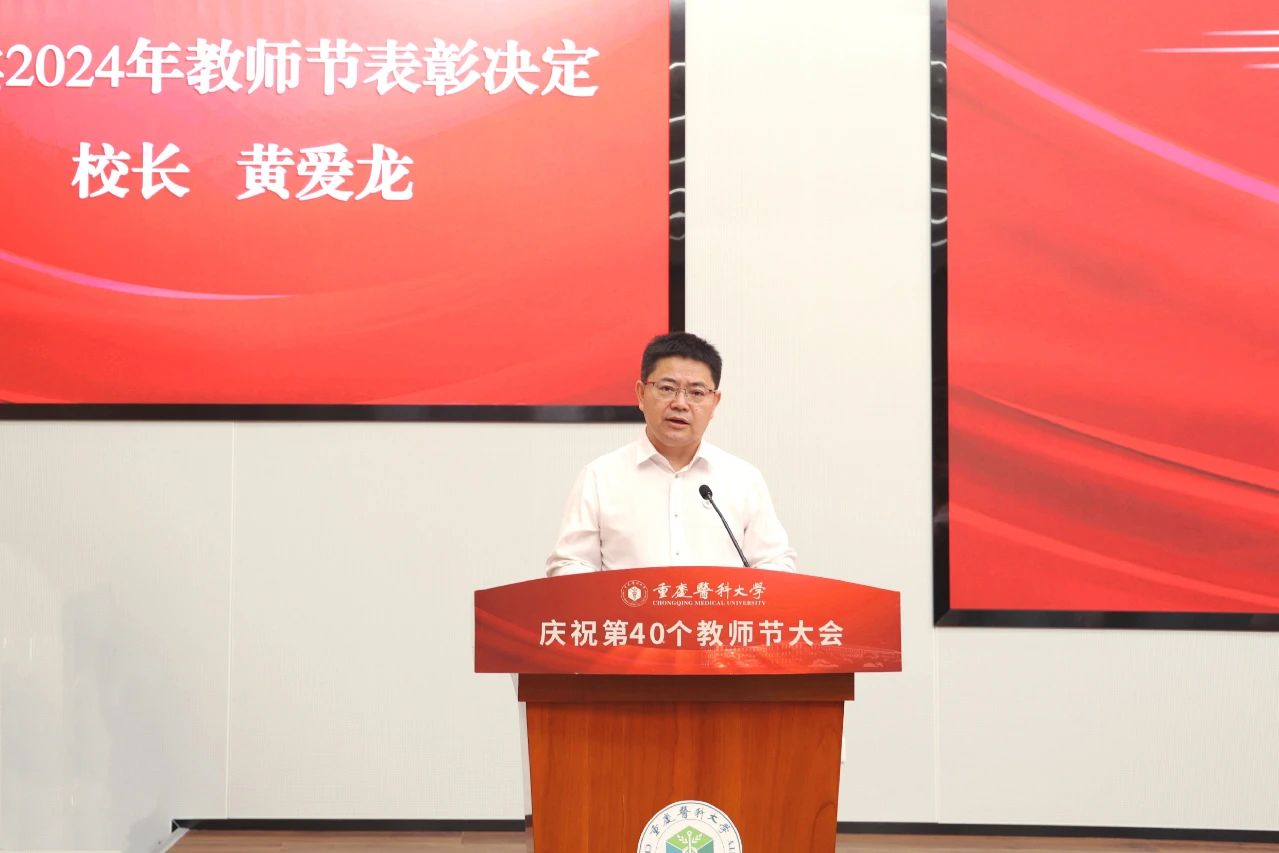校长黄爱龙宣读荣耀体育在线登录入口《关于在第40个教师节表彰优秀个人和团队的决定》,对荣获“全国教育系统先进集体”的荣耀体育在线登录入口儿科学院,荣获第28届“中国青年五四奖章”的周新雨老师,荣获第四届“全国高校教师教学创新大赛三等奖”的律峰老师,入选第五批“重庆市高校黄大年式教师团队”的儿科学教师团队,荣获2024年“重庆市工人先锋号”的人体解剖学教研室等2个团队,荣获2024年“重庆五一劳动奖章”的邓昆等2位老师,荣获2023年度“重庆市高校优秀思想政治教育工作者”的郭笑雨老师,荣获2023年度“重庆市高校优秀辅导员”的阎立珠老师等团队和个人予以表彰。