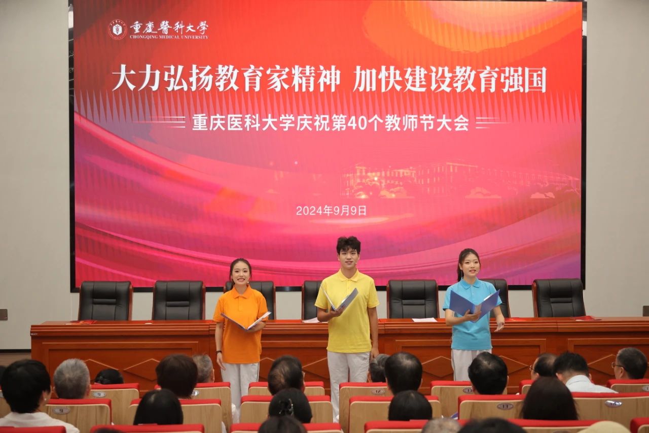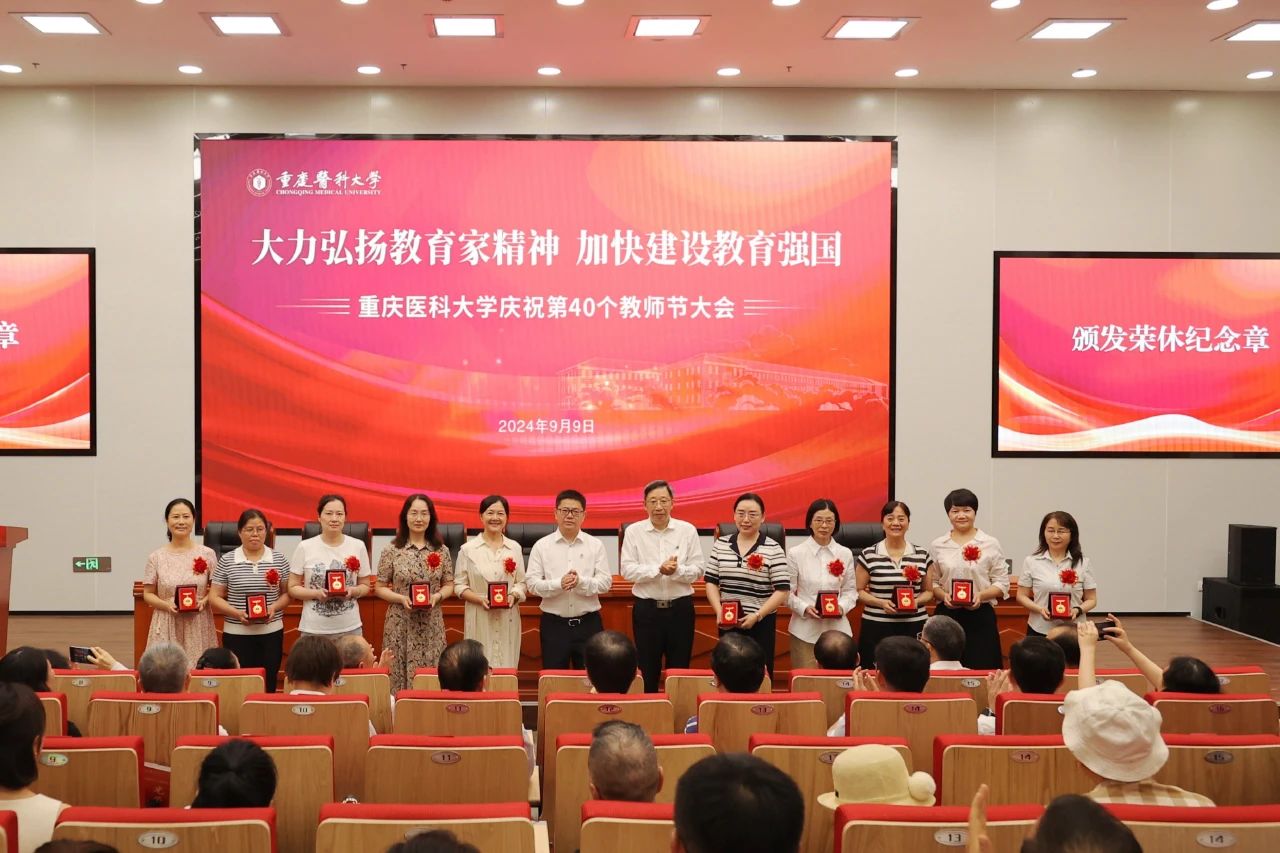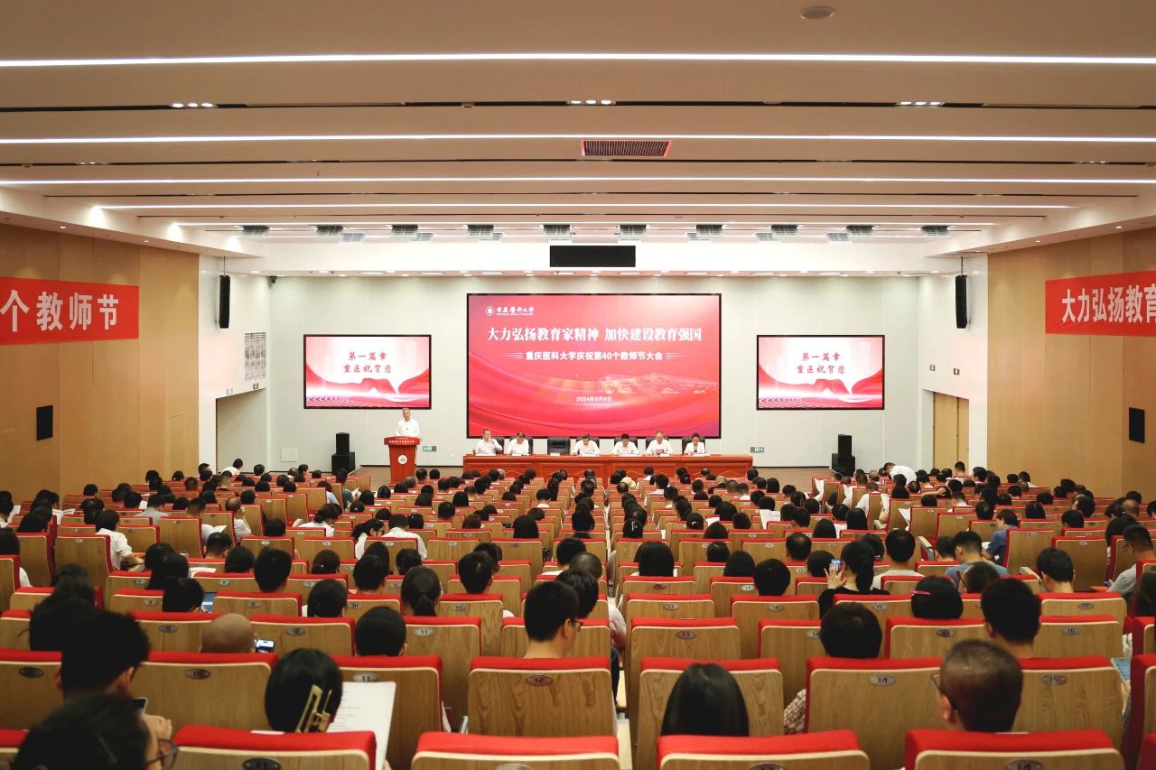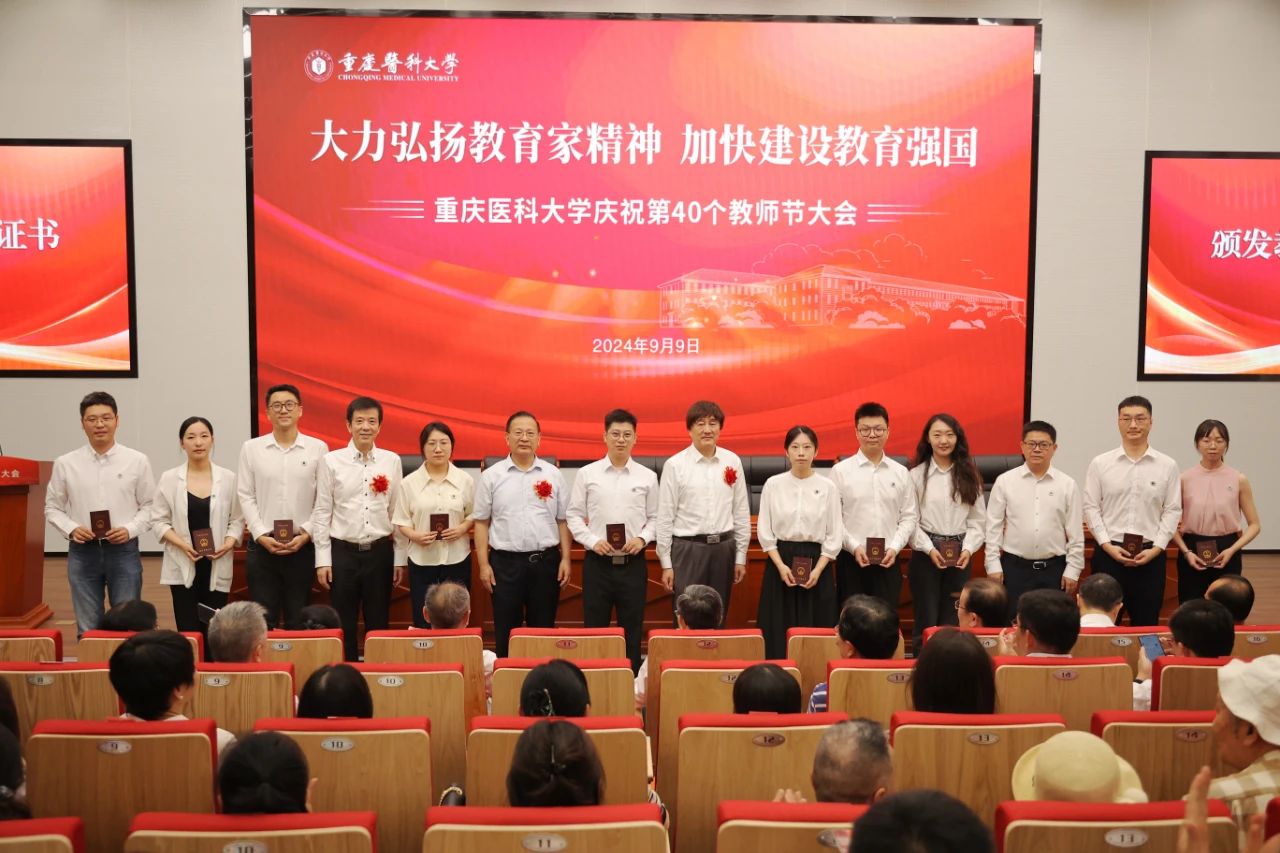 校长黄爱龙宣读荣耀体育在线登录入口《关于在第40个教师节表彰优秀个人和团队的决定》,对荣获“全国教育系统先进集体”的荣耀体育在线登录入口儿科学院,荣获第28届“中国青年五四奖章”的周新雨老师,荣获第四届“全国高校教师教学创新大赛三等奖”的律峰老师,入选第五批“重庆市高校黄大年式教师团队”的儿科学教师团队,荣获2024年“重庆市工人先锋号”的人体解剖学教研室等2个团队,荣获2024年“重庆五一劳动奖章”的邓昆等2位老师,荣获2023年度“重庆市高校优秀思想政治教育工作者”的郭笑雨老师,荣获2023年度“重庆市高校优秀辅导员”的阎立珠老师等团队和个人予以表彰。