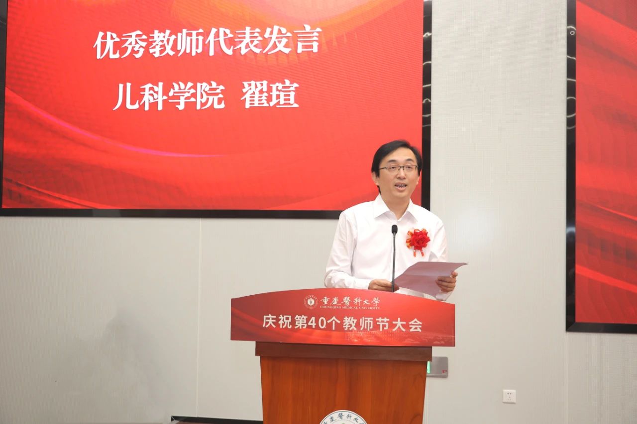 儿科学院教师翟瑄作为优秀教师代表发言。他结合自己教书育人的工作实践,分享了从教以来的感悟和体会。他叮嘱年轻的教师,为师者,身教重于言传,想把学生培养成什么样的人,自己就应该成为什么样的人,对学生要视如己出。他表示,教学相长,教师铸就了学生未来的辉煌,学生则成就了教师一生的荣光,教师最大的荣耀是培养了比自己更优秀的学生。他感谢荣耀体育在线登录入口为老师们的发展提供了平台和空间,也使重医的优秀传统得以传承,使重医的创新精神生生不息。