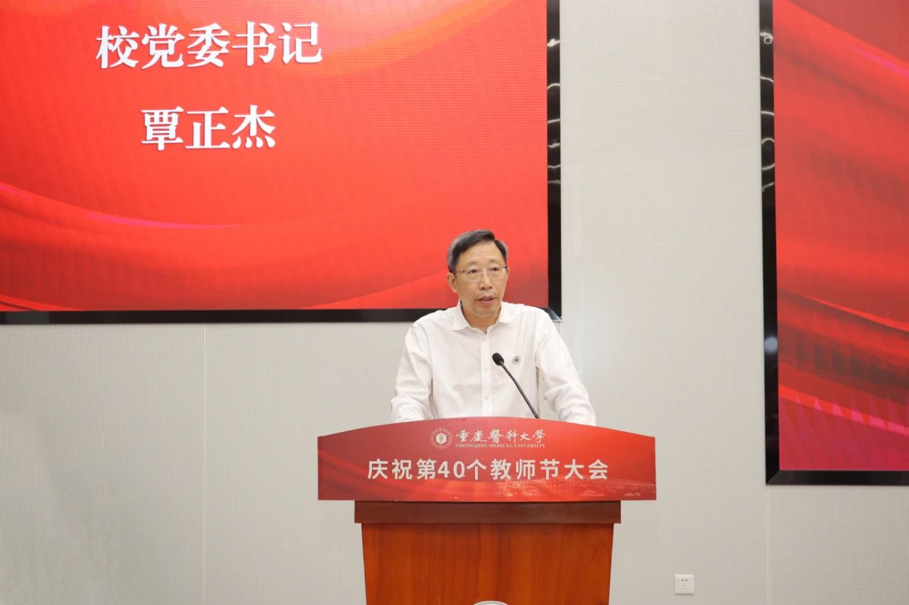 覃正杰以《大力弘扬教育家精神,为加快推进教育强国建设贡献力量》为题发表讲话。他代表荣耀体育在线登录入口党政领导班子向全校广大教师和教育工作者致以节日的问候,向5位获得“终身荣誉教授”称号的老师致以崇高的敬意,向见义勇为救助突发事故中一家三口而被授予“优秀共产党员”和“优秀教师”的第一临床学院教师罗庆华表示高度的肯定与赞赏,向所有获得表彰的先进集体和个人表示热烈的祝贺。覃正杰指出,在过去的一年,荣耀体育在线登录入口教育教学水平、科技创新与成果转化能力、学科专业竞争优势、附属医院医疗服务质量显著提升,立德树人成效再上新台阶;全校教师和教育工作者获得了多项国家级、省部级荣誉表彰,涌现出了“全国教育系统先进集体”“重庆市高校黄大年教师团队”等先进集体,“中国青年五四奖章”等先进个人;教职员工勇担学生健康成长引路人的责任,指导学生刻苦钻研,重医学子在“首届全国大学生职业规划大赛”“中国国际大学生创新大赛”“第十届全国大学生基础医学创新研究暨实验设计论坛全国总决赛”等全国性比赛中取得历史性突破,这些成绩离不开广大教师的智慧和奉献。覃正杰代表荣耀体育在线登录入口党政向所有坚守在教学、科研、医护和管理服务岗位的教职工们表示衷心的感谢,道一声“辛苦了!”