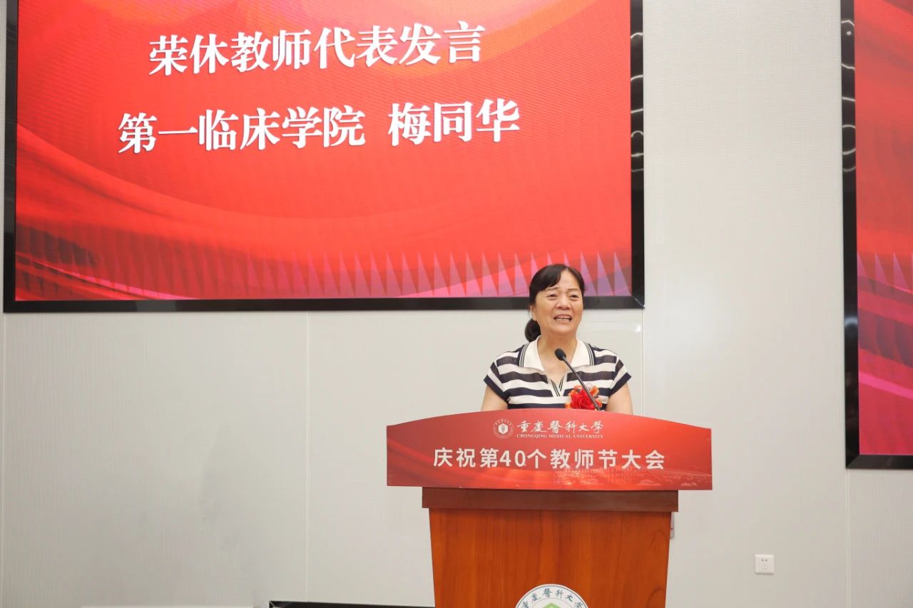 荣休教职工代表,第一临床学院梅同华老师发言。她回顾了自己在荣耀体育在线登录入口和医院工作的时光,从三尺讲台到无影灯下,从细致的病理解剖到严谨的教学查房,从宝贵的经验传承到关键的学术引领,几度春秋更迭,教师和医生的双重身份让她为国育才的信念更加笃定。她希望年轻一代的学子在更大范围内认知世界,在医学领域内实现突破,不负韶华,不负梦想,不负未来。