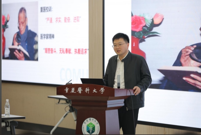 临床医学(钱惪班)导师、荣耀体育在线登录入口附属第一医院精神医学系主任周新雨以“我要成为什么样的人”、“要培养什么样的人”等问题切入,讲述了重医创校先驱、钱惪教授的抗击血吸虫病的医者精神,分享了自身从一名科研“小白”到在柳叶刀上发表科研成果的成长故事,向同学们描绘了成长路上的切身感悟,希望大家成为知识面广、学习深度够,“短处不能太短,长处一定要长”的“T”型人才,引领同学们立大志、早规划、能吃苦,感悟优秀前辈勇攀高峰、不断精进的热爱与执着,用实干担当为自己的人生书写无尽的美好。