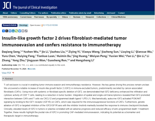 近日,荣耀体育在线登录入口附属第一医院任国胜/李洪忠教授团队联合荣耀体育在线登录入口药学院万敬员教授在国际权威期刊Journal of Clinical Investigation杂志发表了题Insulin-like growth factor 2 drives fibroblast-mediated tumor immunoevasion and confers resistance to immunotherapy的研究论文。