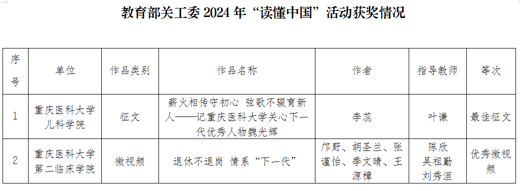 近日,在教育部关工委举办的2024年“读懂中国”活动中,我校儿科学院选送的《薪火相传守初心,弦歌不辍育新人》荣获最佳征文,第二临床学院选送的《退休不退岗,情系下一代》荣获优秀微视频。