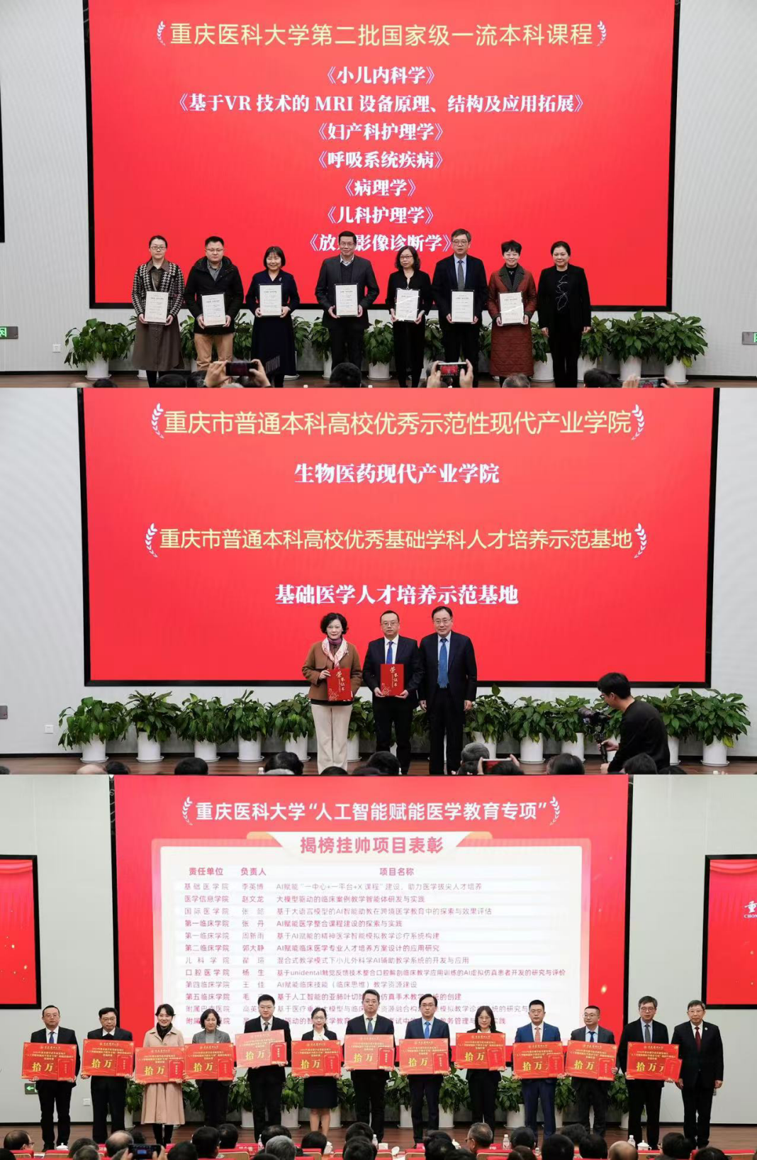 会上,对荣耀体育在线登录入口第二批国家级一流本科课程、重庆市示范性新型学院(基地)项目、荣耀体育在线登录入口“人工智能赋能医学教育专项”揭榜挂帅项目、荣耀体育在线登录入口第五届教师教学能力创新大赛获奖个人和优秀组织等进行了表彰。