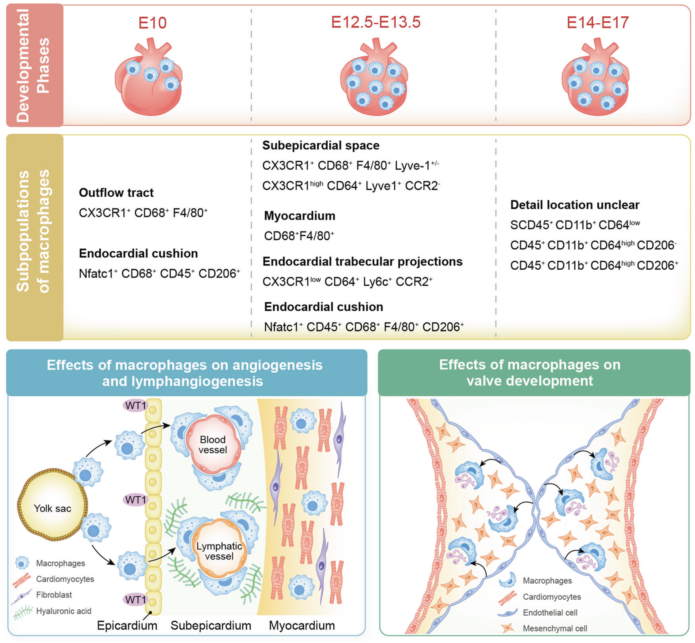 胚胎期心脏巨噬细胞在心脏表面和心外膜空间积累,促进血管和淋巴管的形成以及瓣膜发育,并通过IGF信号等途径发挥促血管作用。虽然目前通过遗传谱系追踪和转录组分析等技术鉴定出多种心脏巨噬细胞亚群,并对这些亚群在心脏发育中的特定功能进行了研究,但胚胎期心脏巨噬细胞的发育来源及其具体功能尚需进一步探讨,以揭示其在心脏发育中的多重作用和分子机制。