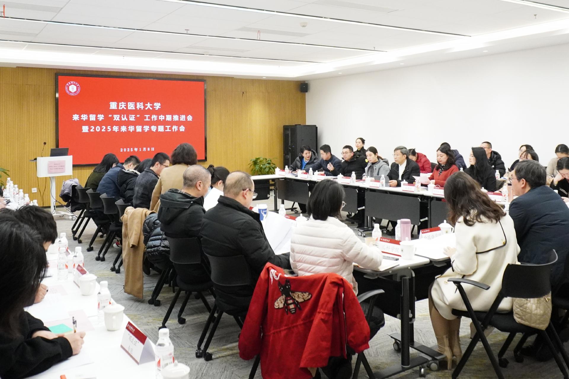 1月8日,荣耀体育在线登录入口在袁家岗校区崇医楼209会议室举行来华留学生高等教育质量认证和来华留学生临床医学专业本科教育(英语授课)专业质量认证工作中期推进会暨2025年来华留学专题工作会。会议由副校长刘恩梅主持。