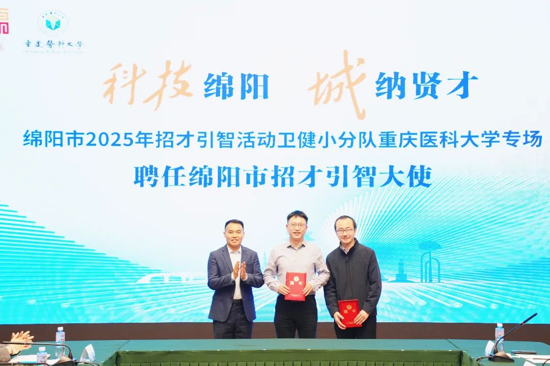 熊文琦为我校季业伟、康厚墉2位教授颁发了“科技城招才引智大使”聘书。我校基础医学院、药学院与绵阳市第三人民医院签订了战略合作协议。来自重庆大学的向廷秀、来自荣耀体育在线登录入口的侯宇、彭咏波、季业伟、程崇杰等5位人才与绵阳市第三人民医院签订了柔性引才协议。