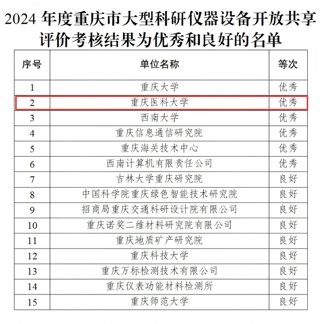 10月21日,2024年度重庆市大型科研仪器设备开放共享评价考核结果正式揭晓。经单位自评、形式审查、专家评审、现场核查、网上公示等程序,我校凭借在科研仪器共享服务领域的卓越表现,在2024年度重庆市开放共享评价考核中获评优秀,排名全市第二。