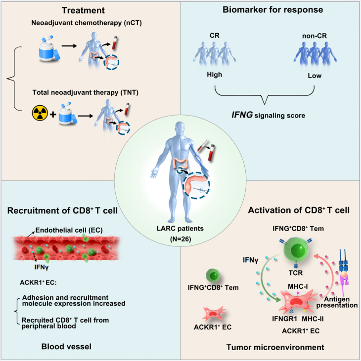 该研究通过多维度技术手段,系统解析全程新辅助治疗(total neoadjuvant therapy, TNT)对局部晚期直肠癌(locally advanced rectal cancer, LARC)肿瘤免疫微环境的重塑,揭示CD8+T细胞与内皮细胞的相互作用是TNT发挥临床疗效的潜在重要原因。该成果为提升结直肠癌治疗疗效、优化临床诊疗方案提供了新视角,有助于我们对结直肠癌新辅助治疗领域复杂机制的理解。