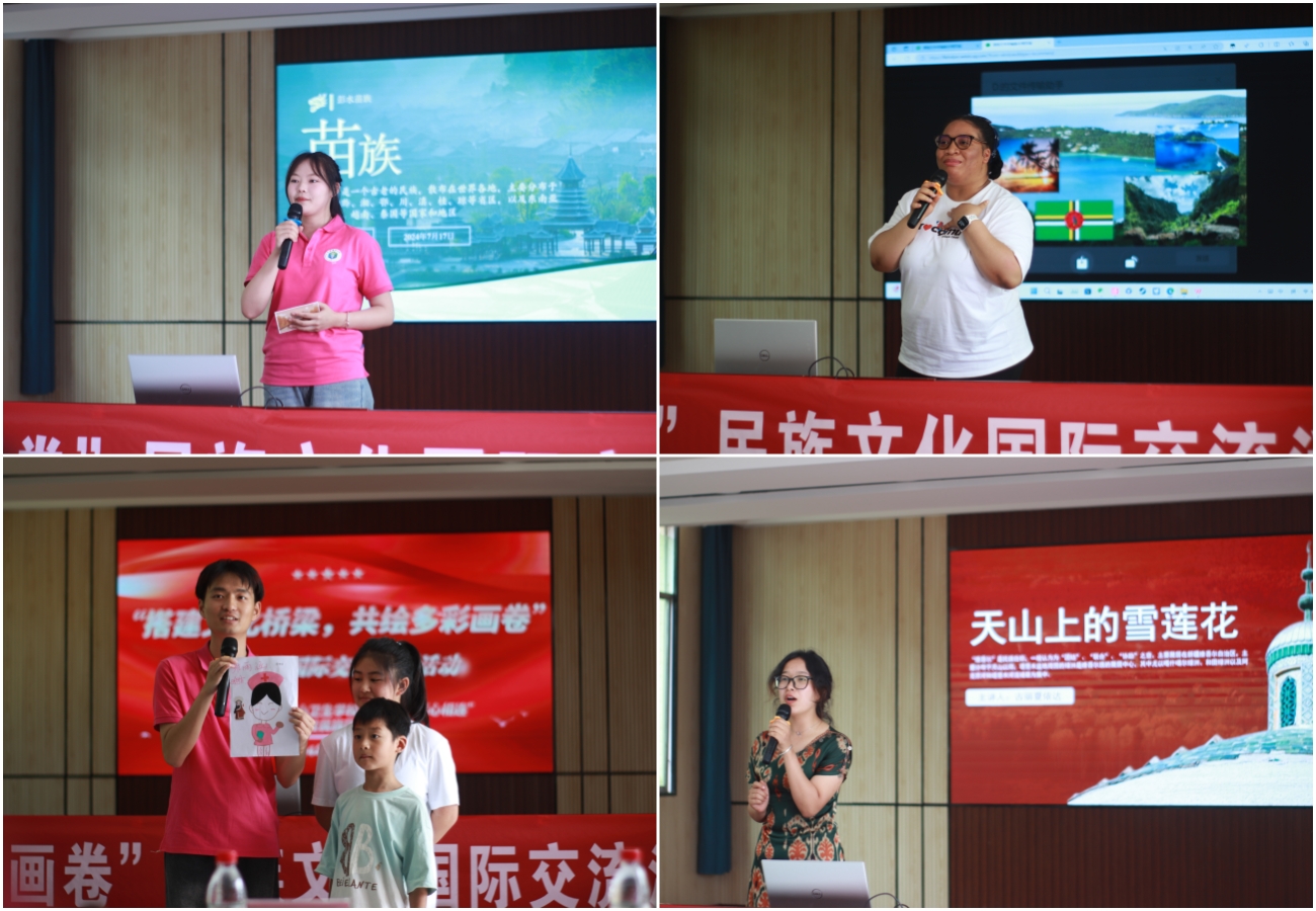 当天下午,冯跃林一行来到桥头镇中心小学“搭建文化桥梁,共绘多彩画卷”民族文化国际交流主题活动现场。当地孩童和志愿者向大家展示了前期思政医学小课堂绘画成果。5名少数民族同学和7名留学生同学分别讲述了自己国家与民族的历史文化、民族特色,并热情邀请现场参会人员一起绘制民族文化国际交流画卷,大家以“我的祖国”、“我的梦想”、“美丽家乡”等为题,创作了富有童趣、饱含期盼、充满希望的美好画卷。冯跃林与当地儿童、实践团队师生交流,了解他们学习、生活、实践情况。
