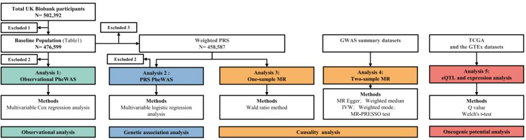 银屑病是皮肤科常见的慢性系统性炎症性皮肤病,癌症是银屑病患者死亡的主要原因之一,但银屑病与部位特异性癌症风险之间的关系尚不明确。本研究基于队列人群,多个全基因组关联分析(GWAS)数据库、以及癌症基因组图谱(TCGA)和基因型-组织表达(GTEx)数据库,采用观察性研究、基因关联分析、孟德尔随机化研究等设计,从临床相关性、潜在因果关系、因果关系,逐步揭示银屑病与不同癌症发病风险的关联。通过顺式-表达数量性状位点(cis-eQTL)分析和基因表达分析,探讨了银屑病相关基因与癌症之间的潜在机制。
