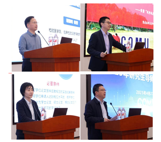 检验医学院谢国明教授结合其研究生教育工作经历,以自身教学科研团队为例,总结分享了有组织培养、指导和管理研究生的宝贵经验。研究生院副院长许瑞、金鑫,研究生党总支书记钟朝晖分别就研究生培养工作流程、学位论文质量保障、落实立德树人根本任务作主题讲座。