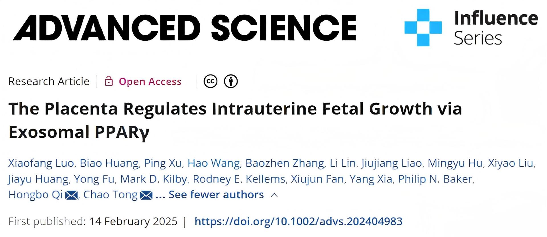 近日,附属第一医院母胎医学漆洪波教授团队在国际权威学术期刊Advanced Science《先进科学》发表文章The Placenta Regulates Intrauterine Fetal Growth via Exosomal PPARγ《胎盘PPARγ经外泌体转运调控胎儿宫内生长发育》,其最新研究成果为生长受限胎儿孕期宫内治疗提供了新途径。附属第一医院漆洪波教授、附属儿童医院童超研究员为本文共同通讯作者,附属第一医院妇产科罗晓芳博士、附属妇女儿童医院产科黄飚博士为共同第一作者。