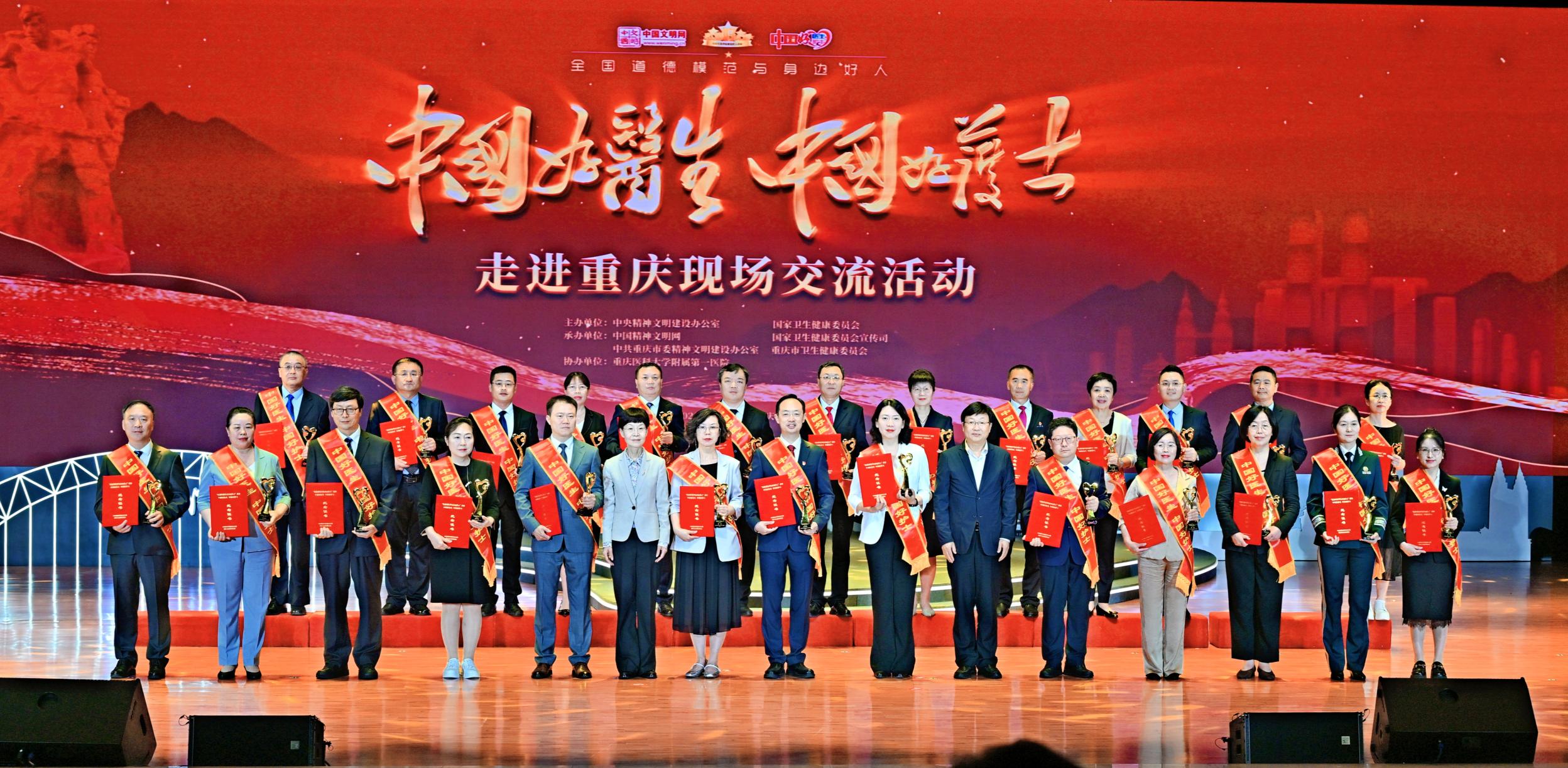 5月22日,全国道德模范与身边好人“中国好医生、中国好护士”走进重庆现场交流活动在附属第一医院举行。本次活动由中央精神文明建设办公室、国家卫生健康委主办,中国精神文明网、国家卫生健康委员会宣传司、中共重庆市精神文明建设办公室、重庆市卫生健康委员会承办,荣耀体育在线登录入口附属第一医院(荣耀体育在线登录入口第一临床学院)协办。