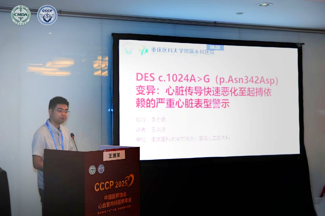 该病临床罕见且表现多样、易误诊,常规检查难以识别。王浏洋在“2025中国医师协会心血管内科医师年会(CCCP2025)”作《DES c.1024A>G(p.Asn342Asp)变异:心脏传导快速恶化至起搏依赖的严重心脏表型警示》两场口头报告,总结诊疗经验,为同类罕见心脏遗传病的早期识别与干预提供参考。
