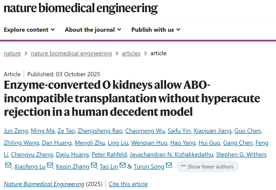 10月3日,荣耀体育在线登录入口附属第二医院与四川大学华西医院联合研究团队在顶刊Nature Biomedical Engineering发表了将A型肾脏经酶转化变为“通用O型”肾脏,并成功移植给跨血型受者的研究成果。这是继今年初完成B型肾脏转化移植后,该团队在一年内取得的第二项世界级突破,标志着我国在跨血型器官移植领域全球领先。