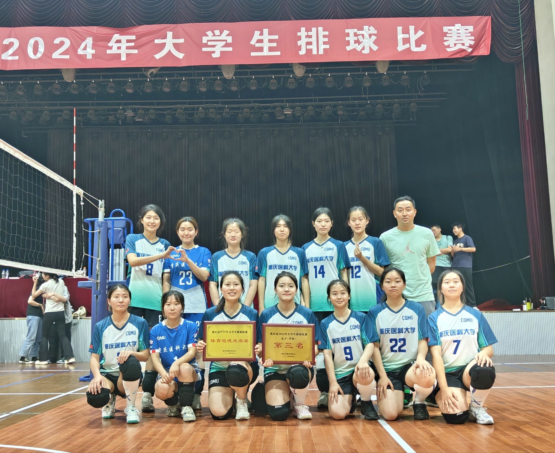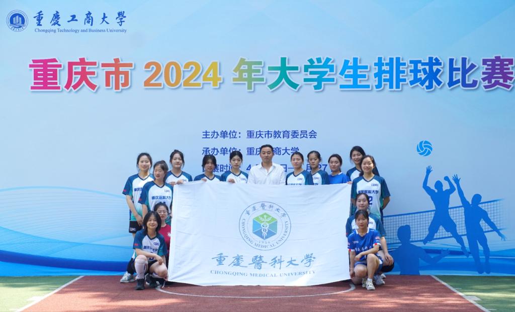 我校女子排球队由体育医学学院院长常青任领队,邓洪波、孙阳老师任教练,带领14名队员参赛。在比赛中,女子排球队队员们团结拼搏,奋勇进取,发挥出高超的竞技水平,夺得女子甲组第三名,一展重医学子的风采。