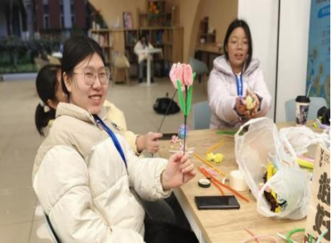 刀画社开展“中药”创意活动,师生用扭扭棒制作中药材主题作品。痕迹文学社推出“杏坛文韵”互动区,参与者化用“杏林”“悬壶”等典故完成接龙游戏,彰显“医文相融,济世为民”的杏林精神。