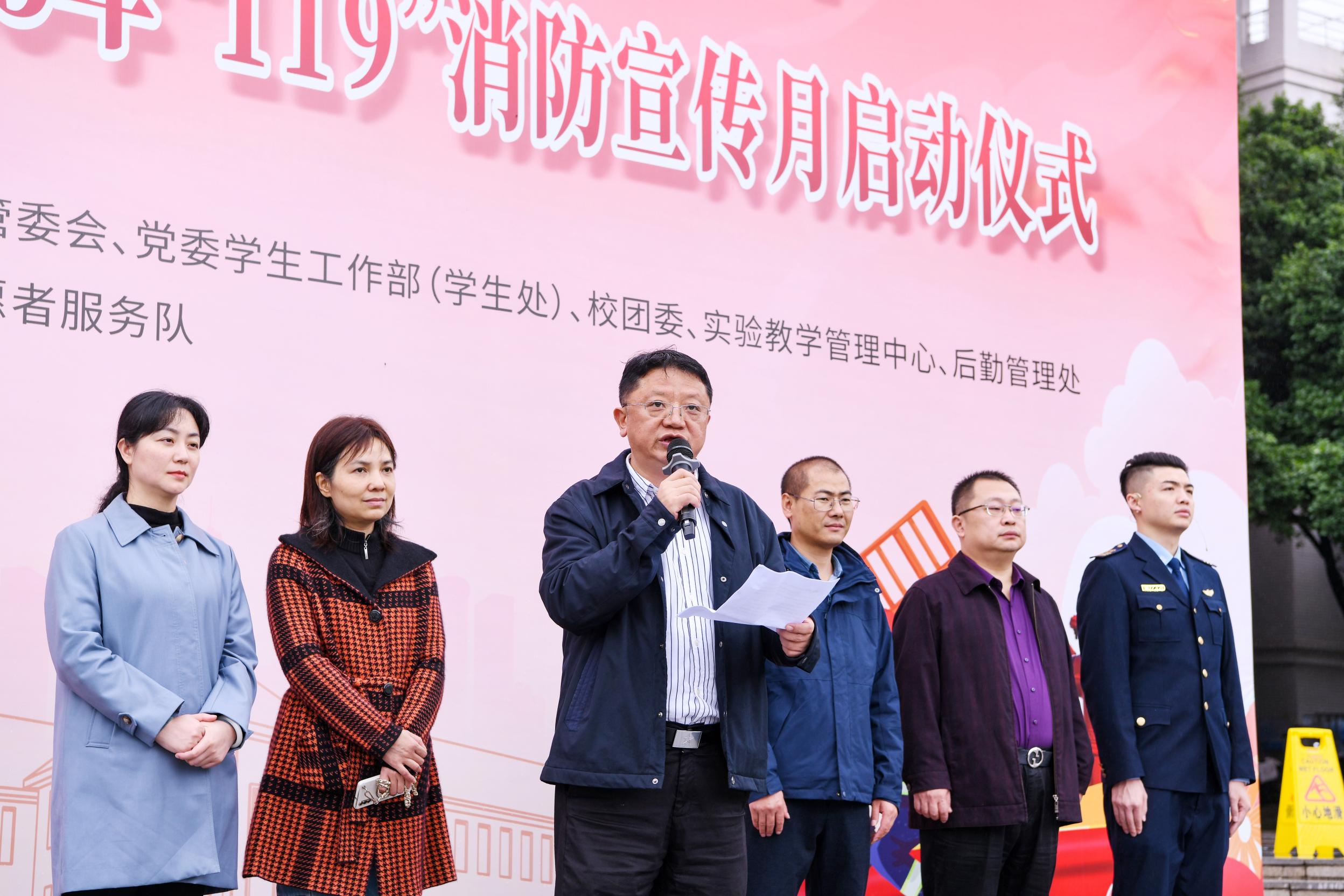 11月7日中午,荣耀体育在线登录入口在缙云校区厚德广场举行2025年“119”消防宣传月启动仪式,780余名师生代表参加活动。启动仪式上,党委保卫部(党委武装部、保卫处)部(处)长胡宝指出,消防安全对保障师生生命财产安全和校园稳定具有重要意义。他希望全体师生以宣传月为契机,积极学习消防知识,提升应急处置能力。