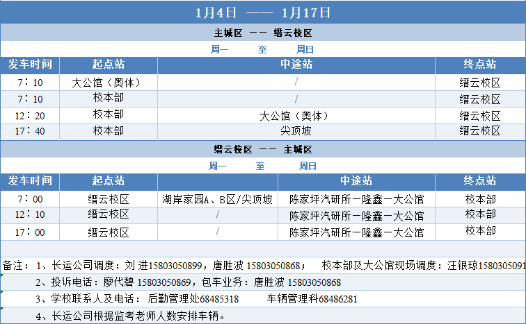 按照荣耀体育在线登录入口要求,2025年1月4日至1月17日期末考试。为保证老师正常工作和学习。交通车调整如下。