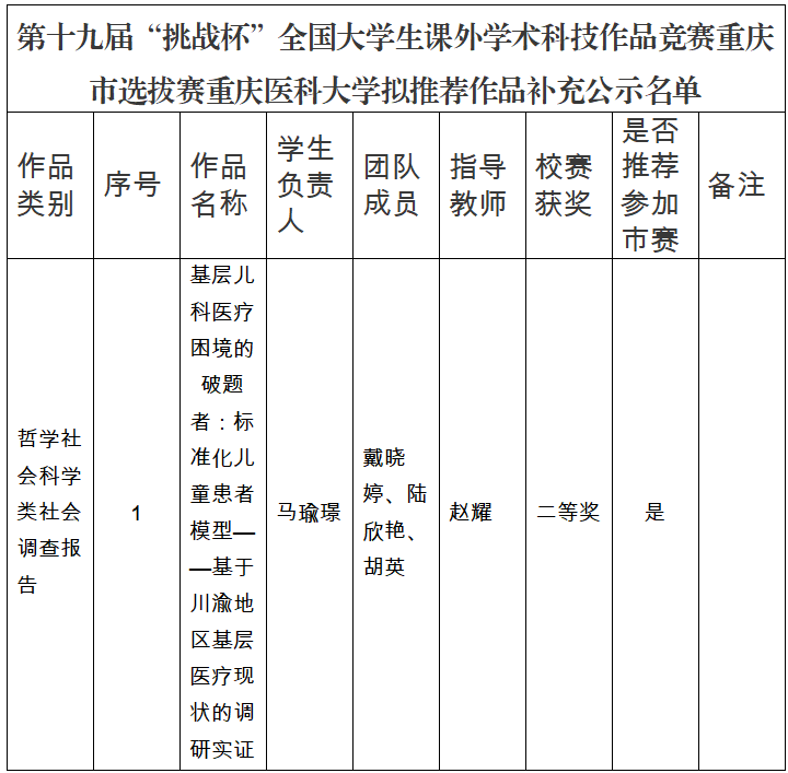 根据团中央、团市委对第十九届“挑战杯”全国大学生课外学术科技作品竞赛的工作部署,2025年4月10日,在前期工作基础上,校团委发布了《第十九届“挑战杯”全国大学生课外学术科技作品竞赛重庆市选拔赛荣耀体育在线登录入口拟推荐作品公示》,在公示期间,接到项目团队申请,现将更新后的调整情况公示如下: