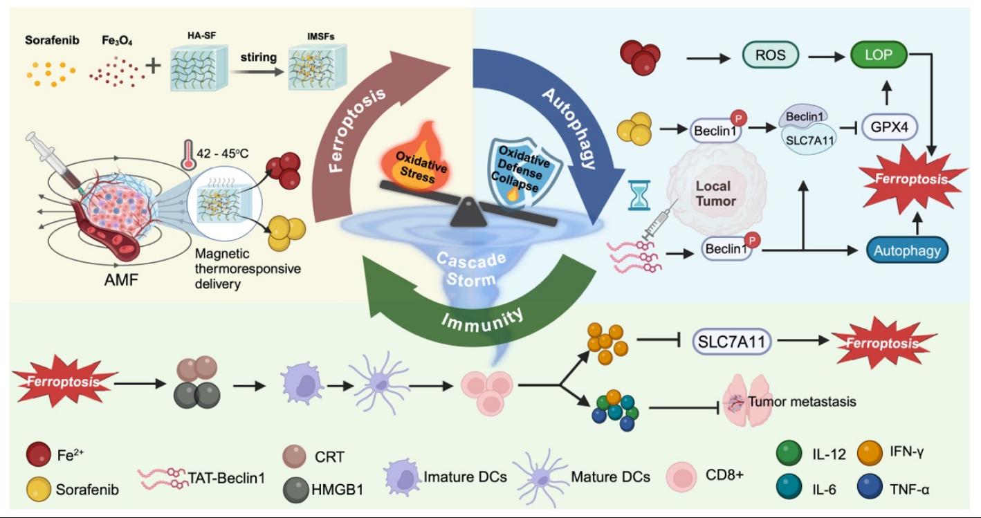 实验结果表明,该平台显示出优异的抗肿瘤疗效,并在TNBC治疗中具显示出良好的临床转化前景。首先IMSFs水凝胶在交变磁场(AMF)的作用下,可以实现肿瘤局部温和热疗并在肿瘤酸性环境下释放铁离子催化芬顿反应驱动活性氧物质(ROS)的生成。此外通过RNA测序分析发现索拉非尼的释放可以通过AMPK-Beclin1-SLC7A11轴来抑制Xc⁻系统,达到局部抑制GPX4的活性并协同促进级联性铁死亡的效应。最后研究人员通过时序控制的TAT- Beclin1局部注射的方式,在极大保留活性的同时,避免过早自噬抑制ROS的蓄积,进一步推动Beclin1-SLC7A11复合体形成放大铁死亡,通过铁死亡-自噬协同激活免疫原性细胞死亡(ICD),促进DC细胞成熟和T细胞分化,促发CD8+T细胞释放IFN-γ细胞因子下调SLC7A11表达。最终该SF- platform通过建立一个自我放大的“铁死亡-自噬-免疫”循环,推动三阴性乳腺癌氧化防御崩溃,达到抑制肿瘤生长和转移的目的。这种综合性的全新的癌症治疗模式,可以实现精准可控的靶向治疗,最大程度的提高治疗效果减少副作用。